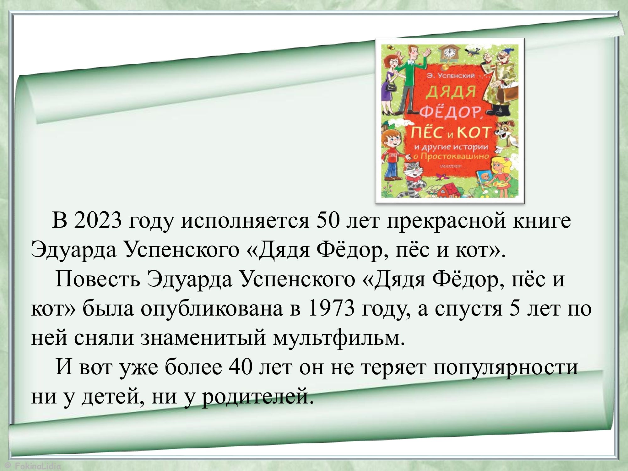 Книге Эдуарда Успенского «Дядя Фёдор, пёс и кот» в 2023 году исполняется 50 лет.