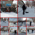 Бөбекжай ұжымы алаңды қардан тазалауға көмектесіп ат салысуда.