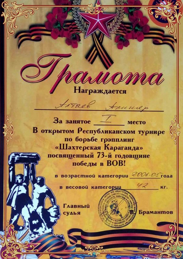 В откыртом Республиканском турнире по борьбе грепплинг "Шахтерская Караганда " Посвященный 73 -ой годовщине победы в ВОВ ученик 6 "Ә" класса Алтаев Алишер занял 1 место