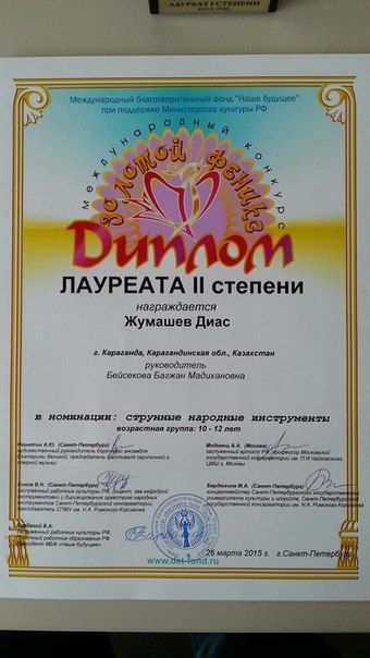 Санкт - Петербургта өткен "Золотой Феникс" байқауына 6 Б сынып оқушысы Жумашев Диас және Толеген Мади қатысып, І орынды иеленіп қайтты.