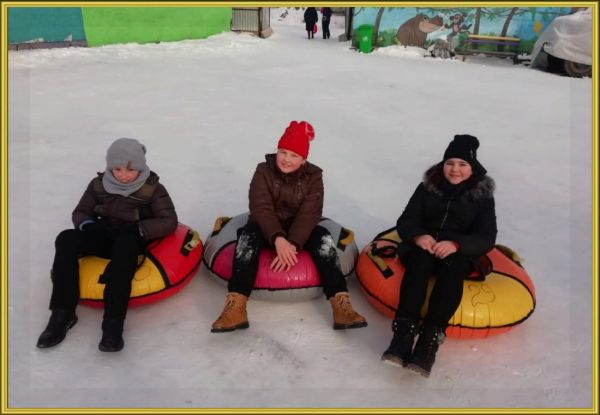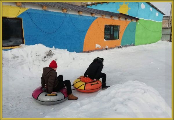На зимних каникулах ученики 5 б класса посетили кинотеатр "Сарыжайлау". Затем ребята весело провели время, катаясь на горке.