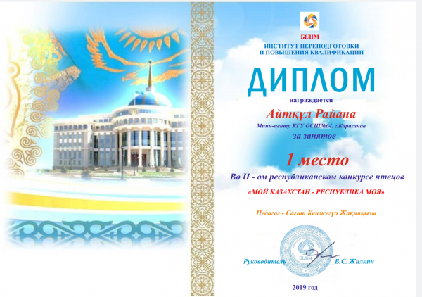 "Менің Қазақстаным - Республикам менің" атты облыстық байқауына қатысып 1 орынға ие болған, Айтқұл Райананы құттықтаймыз.