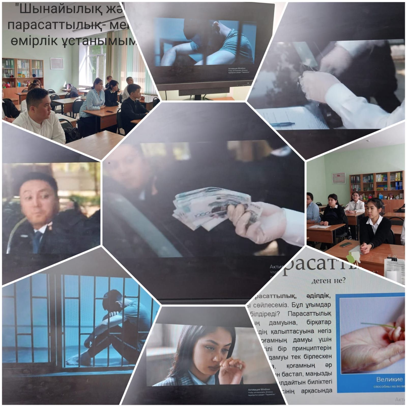 Сыбайлас жемқорлыққа қарсы бағытта, жемқорлыққа "мүлдем төзбеушілік" көзқарасты қалыптасыру мақсатында 8 "А" сыныныбында "Шынайылық және парасаттылық - менің өмірлік ұстаным…