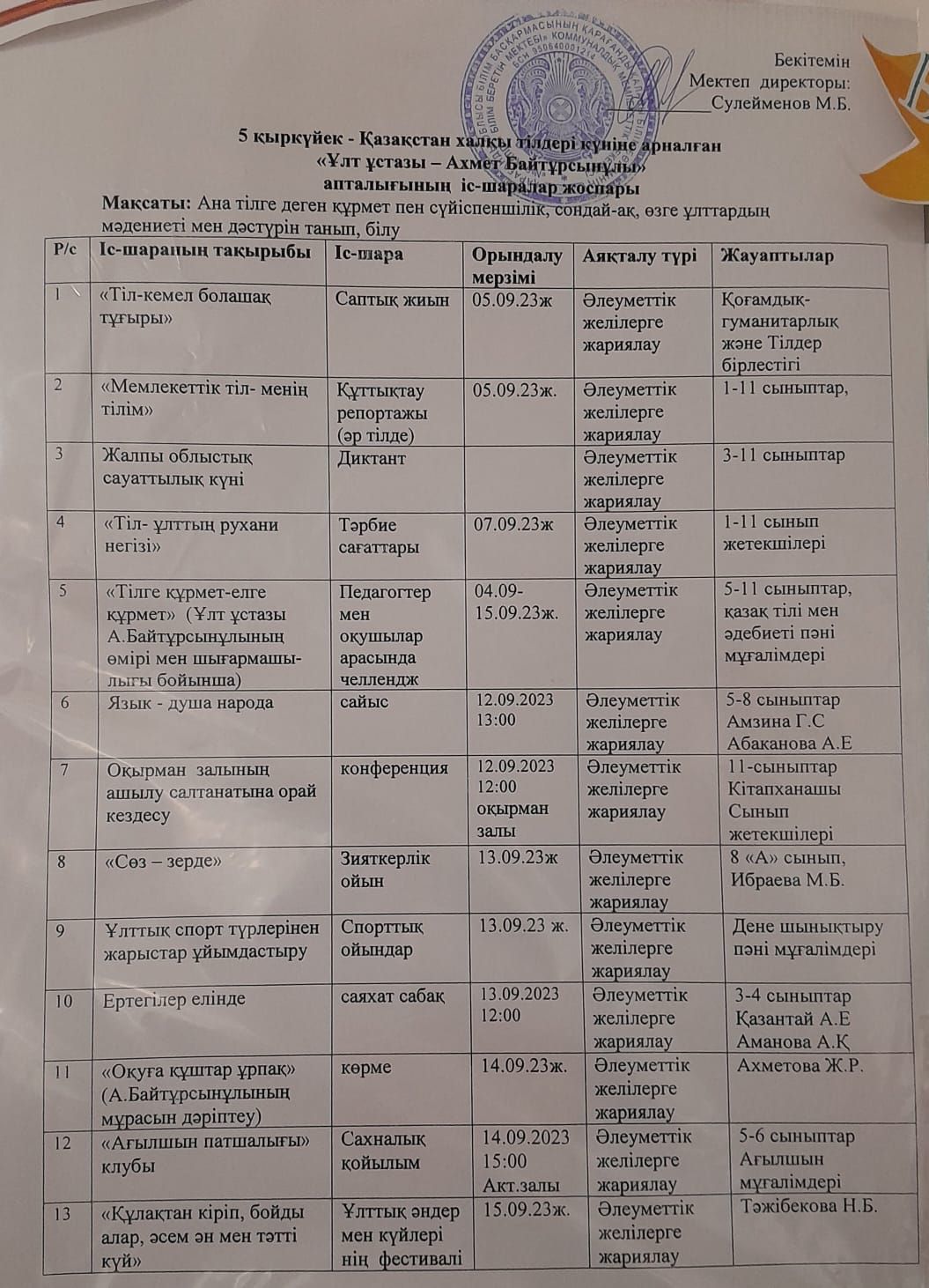 5 қыркүйек- Қазақстан халқы тілдер күніне арналған "Ұлт ұстазы- Ахмет Байтұрсынұлы" апталығының іс- шаралар жоспары.