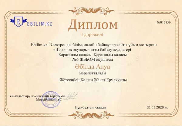 Онлайн байқаулар сайтының ұйымдастыруымен өткен Республикалық Абай оқулары мен Шаханов оқуларының жүлдегері Әбілда Алуаны құттықтаймыз!
