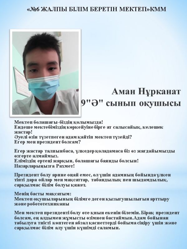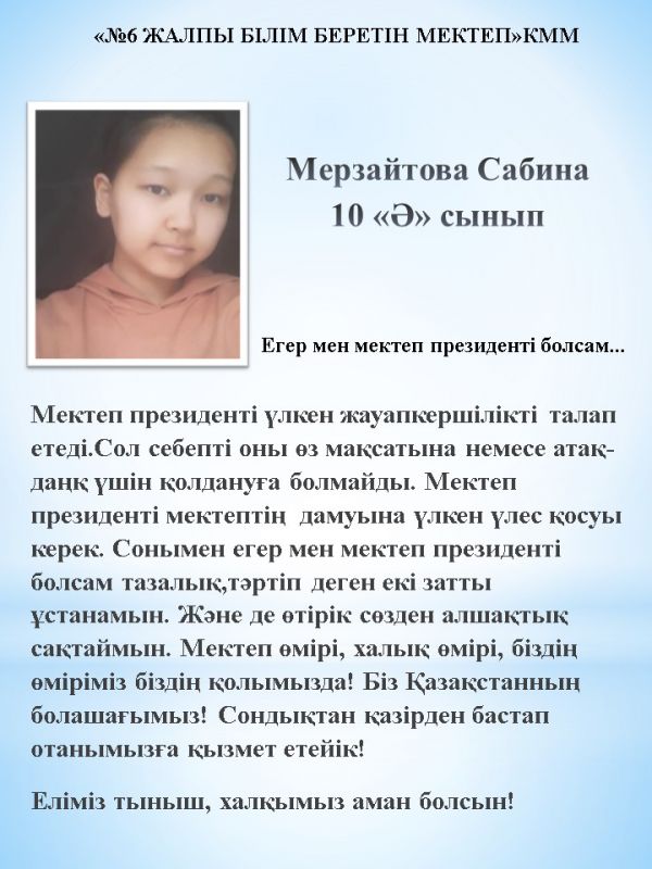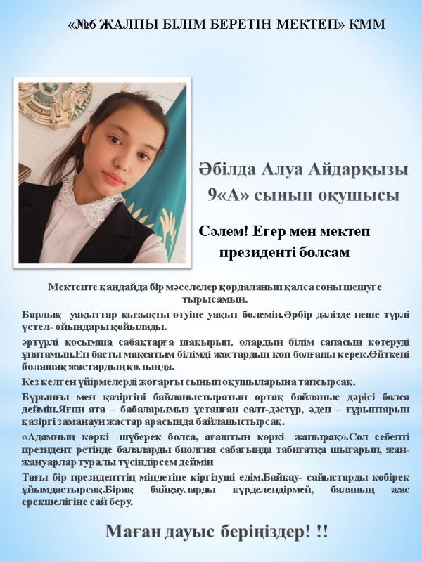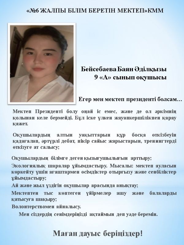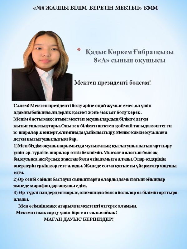№6 жалпы білім беретін мектебінің президентін сайлау науқаны басталды. Үміткер оқушыларымызға сәттілік тілейміз! Ең мықты деген үміткеріміз жеңіс…