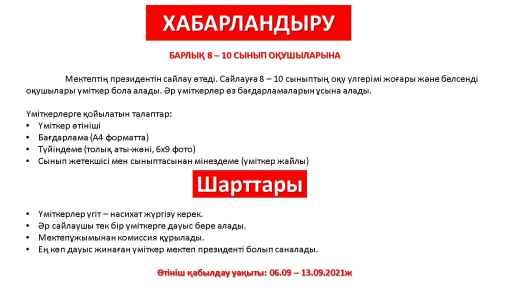 Мектептің президентін сайлау өтеді. Сайлауға 8 – 10 сыныптың оқу үлгерімі жоғары және белсенді оқушылары үміткер бола алады.…