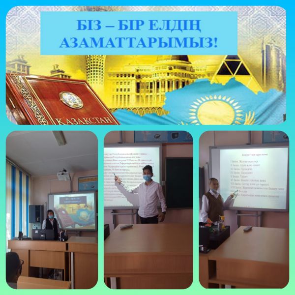 03.09.2021 жылы 10 «Ә» сыныбында Қазақстан Республикасының Конституция күніне арналған «Біз-бір елдің азаматтарымыз!» тақырыбында сынып сағаты өтті.