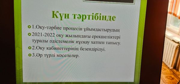 2021 жылы 27 тамызда жаратылыстану-математикалық пәндер бірлестігінің әдістемелік отырысы өтті. Отырыста пән мұғалімдері 2021-2022 жаңа оқу жылының әдістемелік нұсқау хатымен танысып,талдау жасады.…