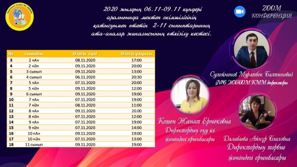 2020 жылдың 8-9 қараша күндері 2а, ә, 3ә, 5ә, 7ә, 8а,10а, 11а - сыныптарда мектеп әкімшілігінің қатысуымен ата-аналар жиналысы өтті. Мектеп директоры М.Б.Сулейменов директордың оқу ісі жөнінде…