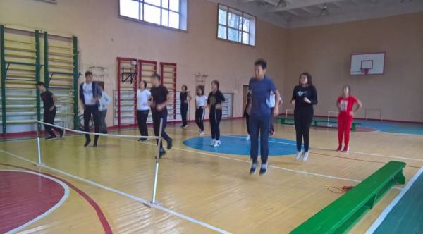 Әдістемелік онкүндік аясында денешынықтыру пәні мұғалімі Е.А.Смагуловтың 10- сыныпта өткізген «Секіру және оның түрлері» атты ашық сабағынан көрініс