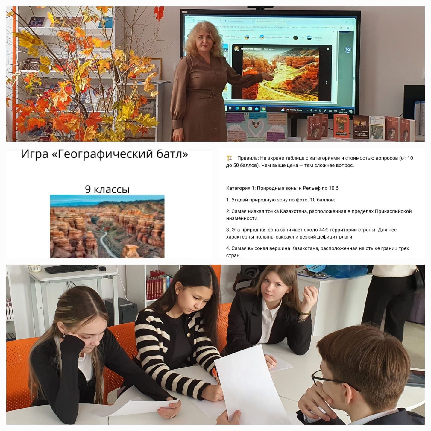 5 ақпанда «Ош 65» КММ-де жаратылыстану пәндері апталығы аясында «География шайқасы» өтті. 180 ұпаймен 9-сынып командасы жеңіске жетті. Құттықтаймыз, студенттер!