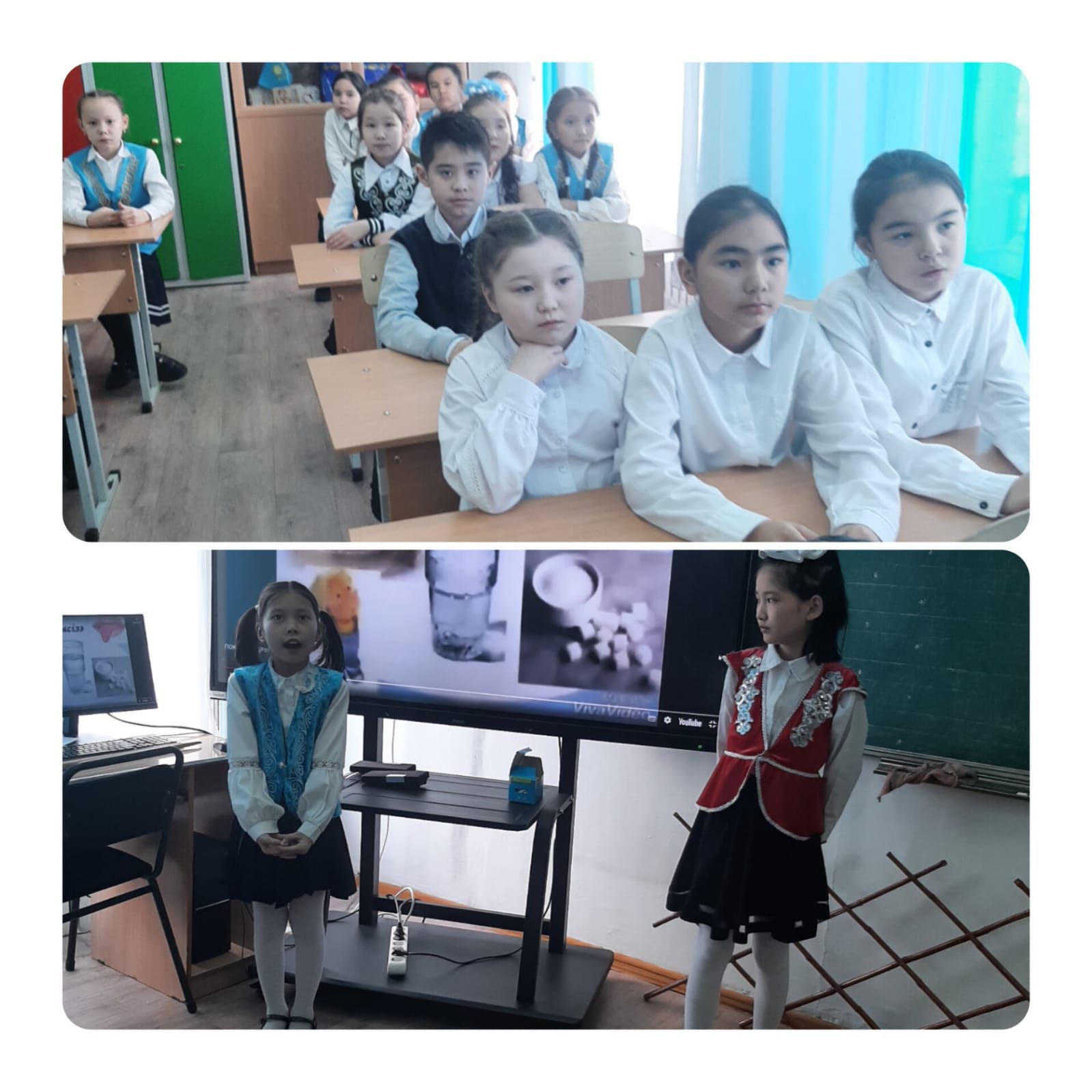 №65 ЖББМ - тің 4"Б" сынып оқушыларымен "Су - тіршілік көзі" тақырыбында сынып сағаты өтті. Мақсаты: судың маңызы, қасиеті туралы білімдерін кеңейту.