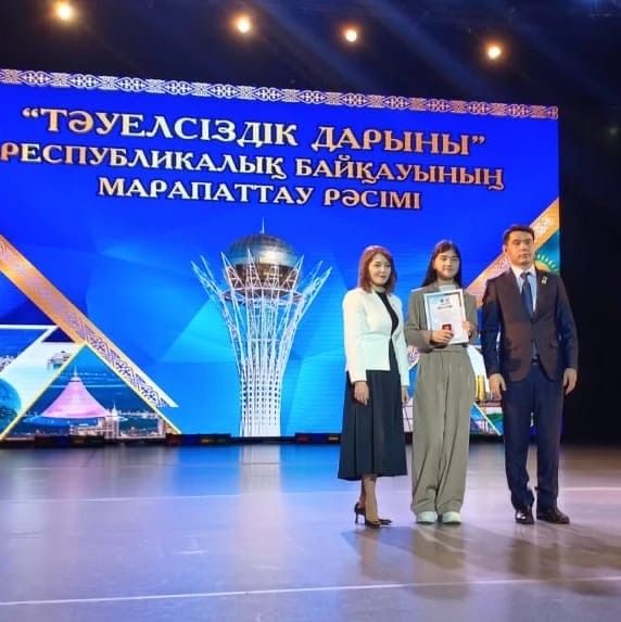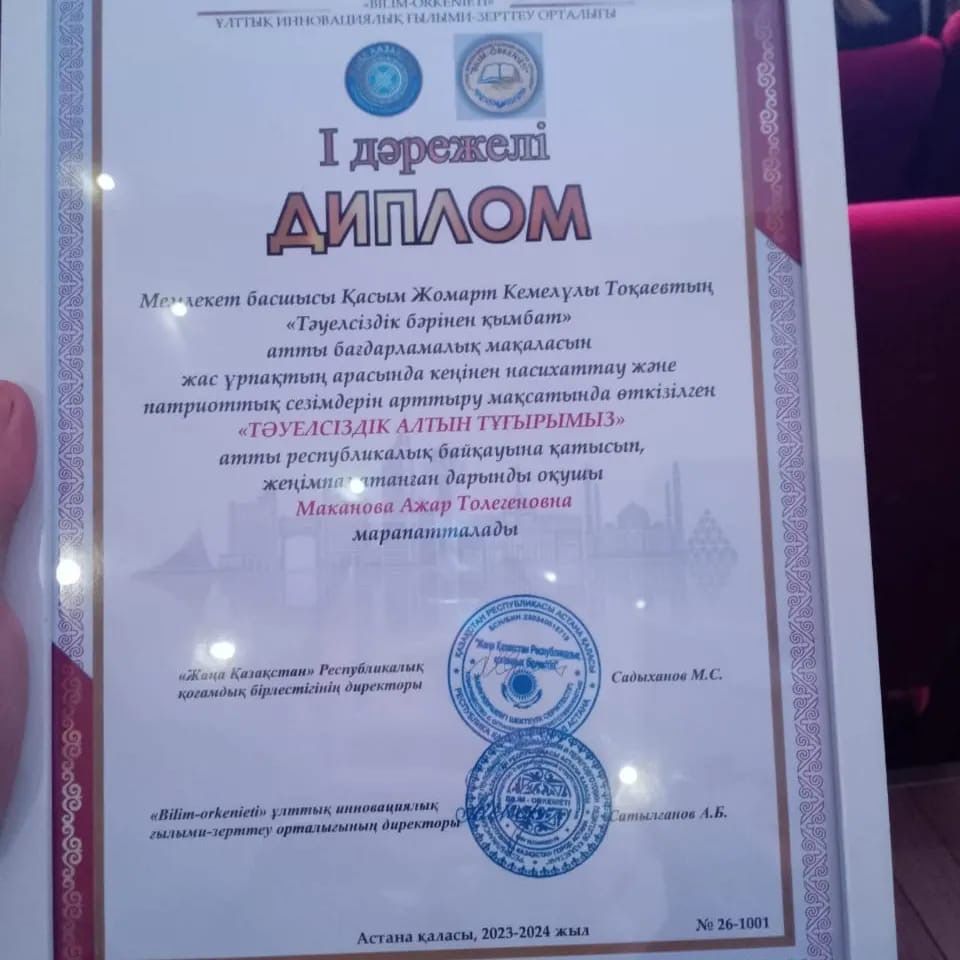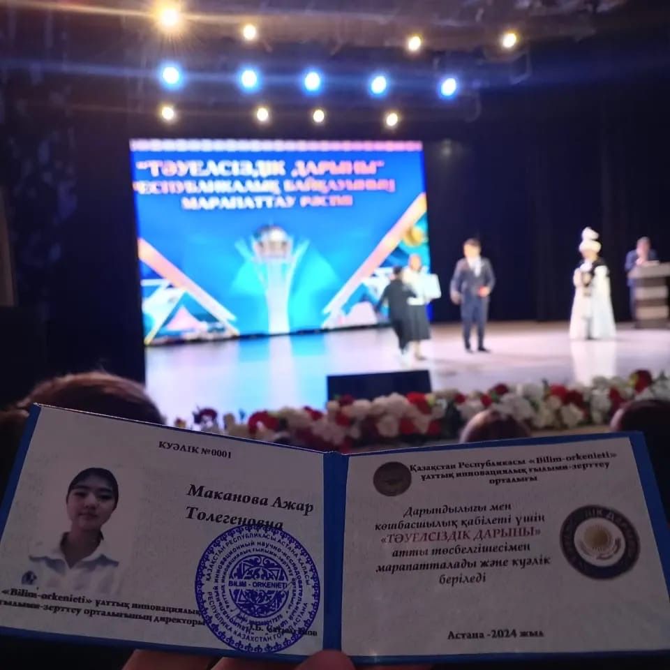 26.01.24ж Астана қаласында “Тәуелсіздік Дарыны” Республикалық байқауының 1-дәрежелі жеңімпазы Маканова Ажар 7 сынып оқушысы. Құтты болсын!!!