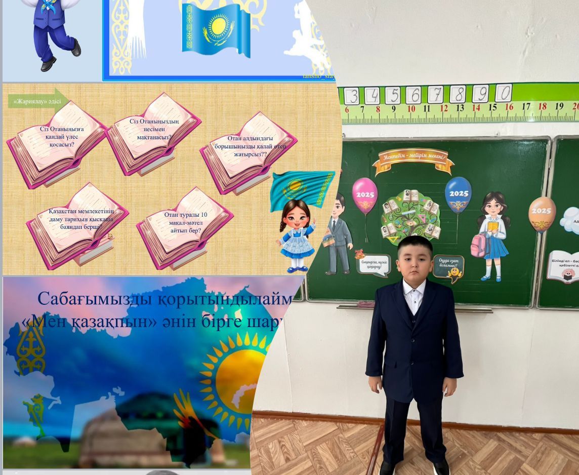02.09 күні 2 "Ә" сыныбында "Менің Отаным - Қазақстан" тақырыбында сынып сағаты өтті . Мақсаты:• Оқушыларға Қазақстанның тарихын, мәдениетін, табиғатын таныстырып, елге деген сүйіспеншілік пен патриотт…