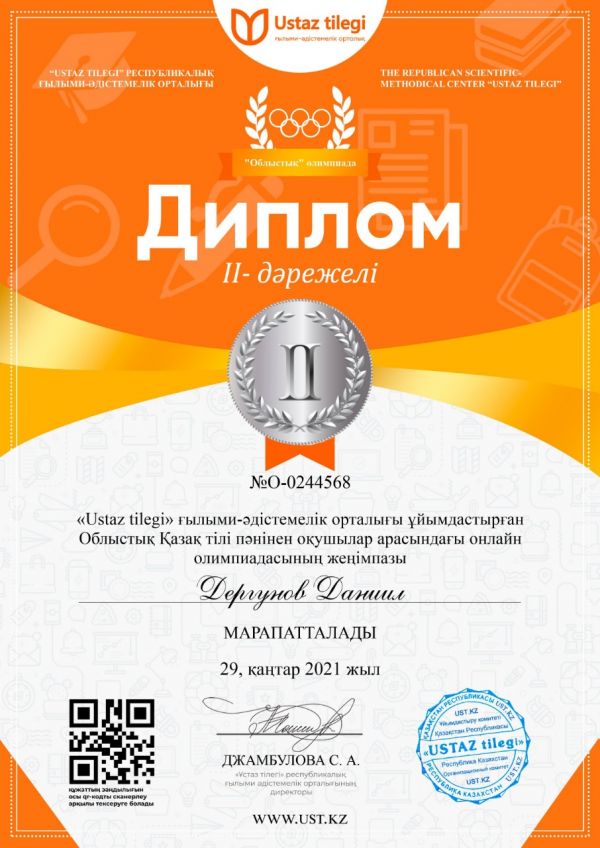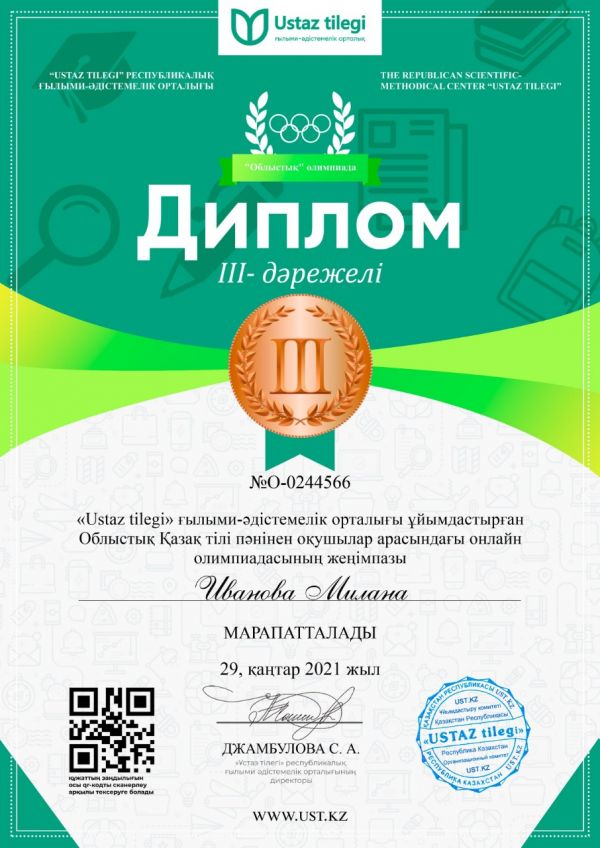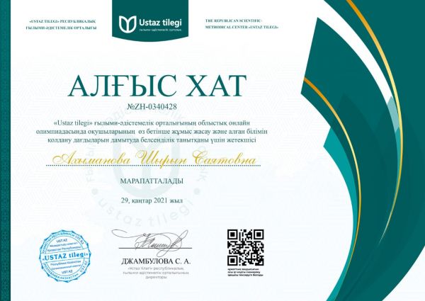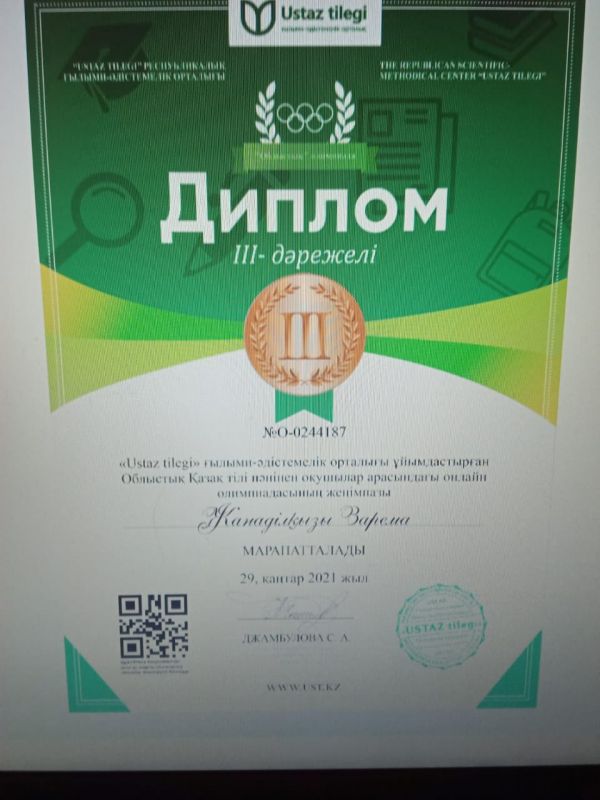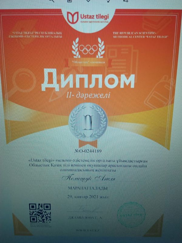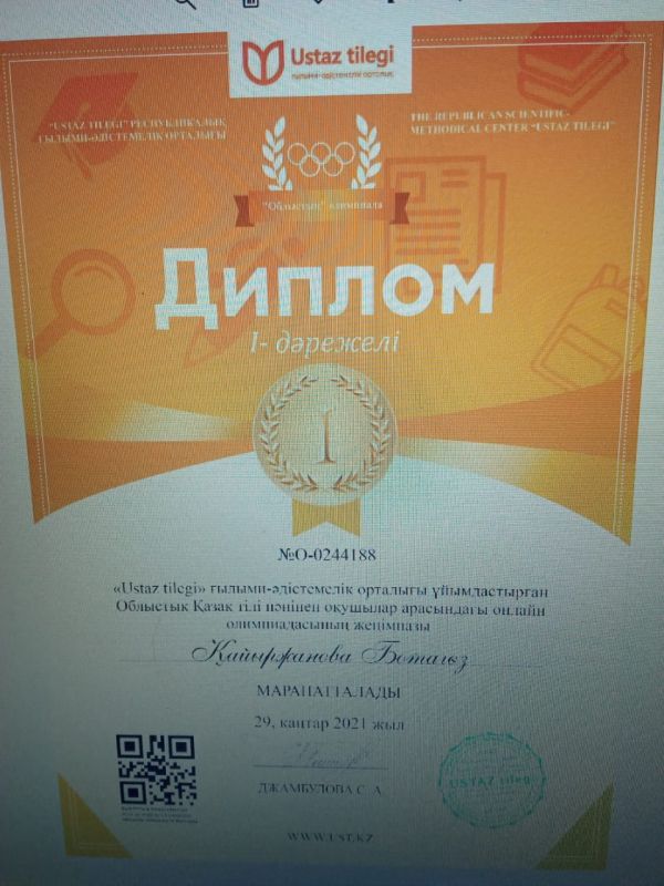 "Ustaz tilegi" ғылыми-әдістемелік орталығы ұйымдастырған Облыстық қазақ тілі пәнінен оқушылар арасында өткізілген олимпиада жүлдегерлері. Жетекшісі: Ахыманова Шырын Саятовна.