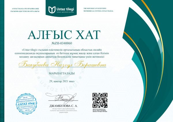 "Ustaz tilegi" ғылыми-әдістемелік орталығы ұйымдастырған Облыстық қазақ тілі пәнінен оқушылар арасында өткізілген олимпиада жүлдегерлері. Жетекшісі: Баяубаева Назгуль Борашевна