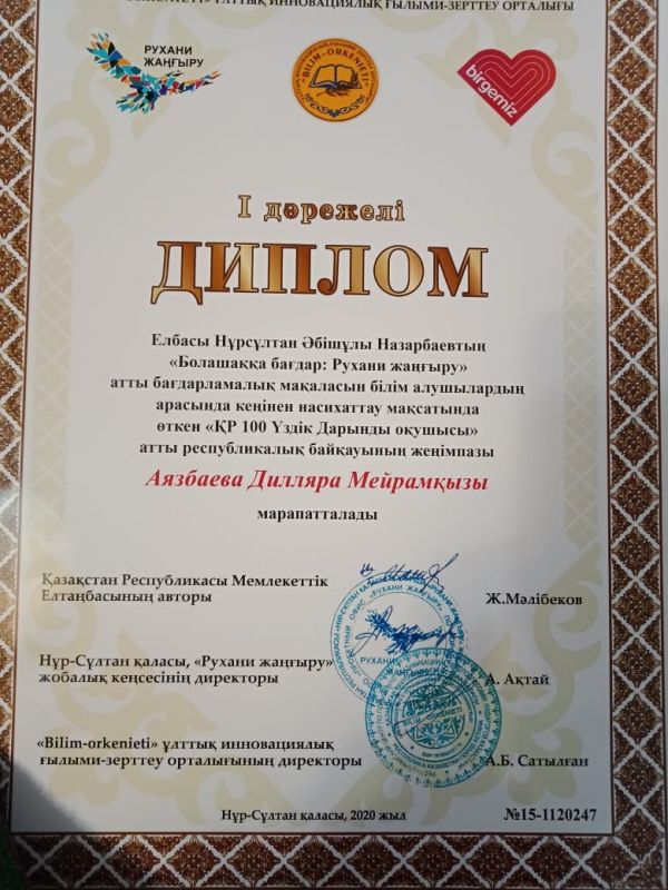 за участие в Республиканском конкурсе "ҚР 100 Үздік Дарынды оқушысы", организованный национальным инновационным научно - исследоват…