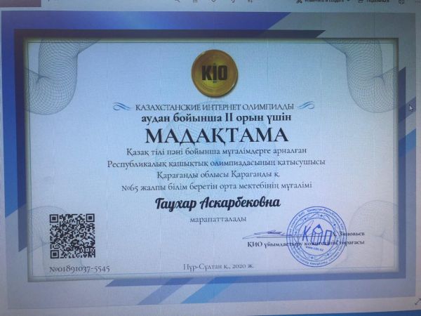 Қазақ тілі пәні бойынша мұғалімдерге арналған республикалық қашықтық олимпиадасында аудан, облыс бойынша ll орын алған қазақ тілі мен әдебиет пәні мұғалімі Масалимова Гаухар Асқарбекқызын құттықтайм…