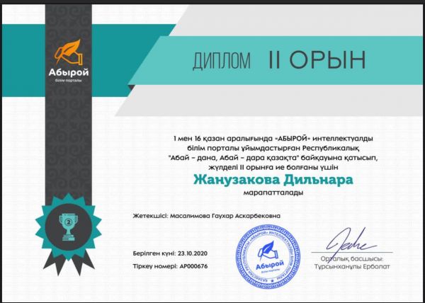 Республикалық "Абай - дана, Абай - дара қазақта" байқауына қатысып, жүлделі 2 - орынға ие болған 9 сынып оқушысы Жанузакова Дильнараны құттықтаймыз!