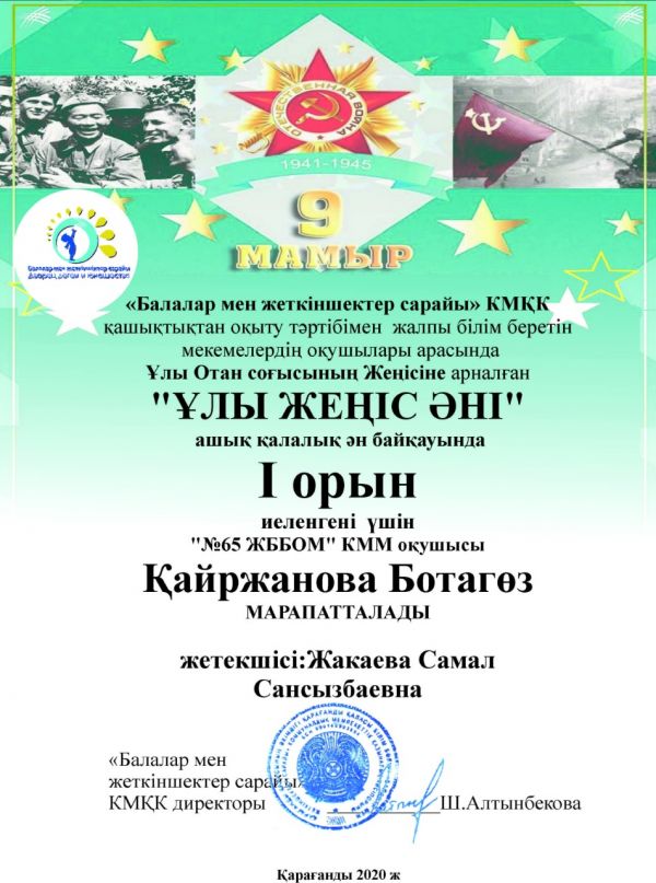 2020 жылдың мамыр айының 10-20 жұлдыздары аралығында «Балалар мен жеткіншектер сарайы» КМҚК қашықтықтан оқыту тәртібі мен жалпы білім беретін мекемелердің оқушылары арасында Ұлы От…