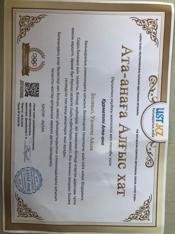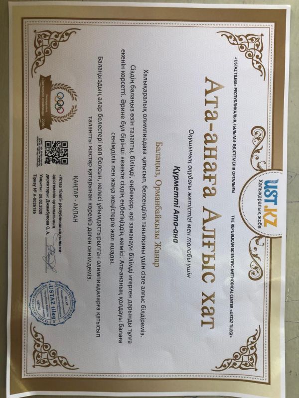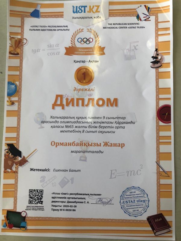 Ziatker.kz Білім және Ғылым порталы ұйымдастырған Халықаралық "зияткерлік олимпиада 2020" да біздің мектептің 8 сынып оқушылары: Лензатова Айшабибі дүние жүзі тарихынан 1 орын, Орынбай Жан…