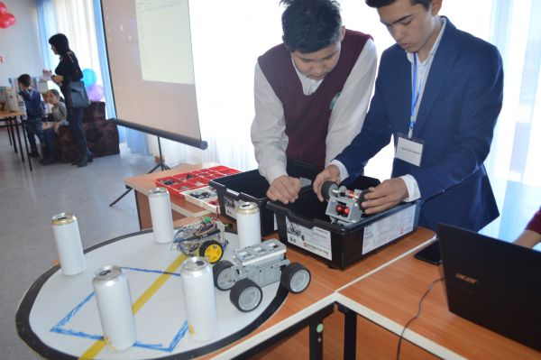 Учитель информатики Болат Е. представил проект «Робототехника», на котором учащиеся демонстрировали игры «Кегельринг»