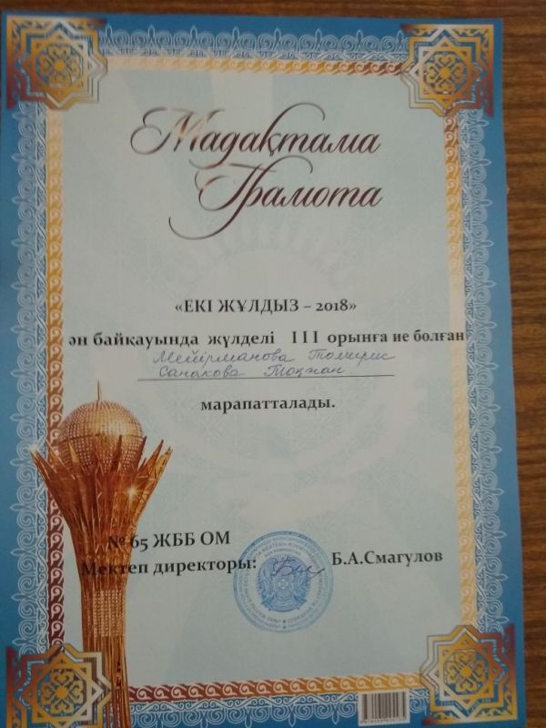 № 65 жалпы білім беретін орта мектепте «Екі жұлдыз-2018» ән байқауына 6 «А» сынып оқушысы Санакова Тоғжан мен Мейірманова Томирис қатысып 3 орынға ие болып, грамотамен марапа…
