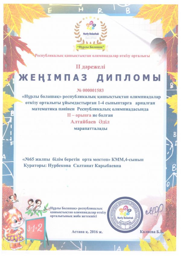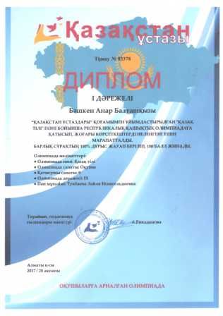 28 ақпан 2017 жыл. Қазақ тілі пәні бойынша Республикалық қашықтықтан олимпиада қатысып, жоғары көрсеткіштерге иеленгендері үшін дипломмен марапатталды. Жетекшісі: Қазақ тілі мен әдебиеті пәні…