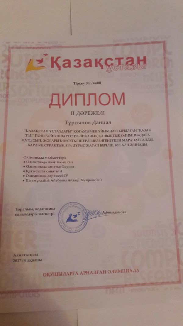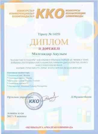 2017 жылдың ақпан айында Республикалық қашықтықтан оқыту олимпиядасы өтті.3-4 сынып оқушылары қатысып 1-ші және 2-ші дәрежелі димломмен марапатталды.Оқушыларды дайындаған еңбегі үшін қазақ тіл…