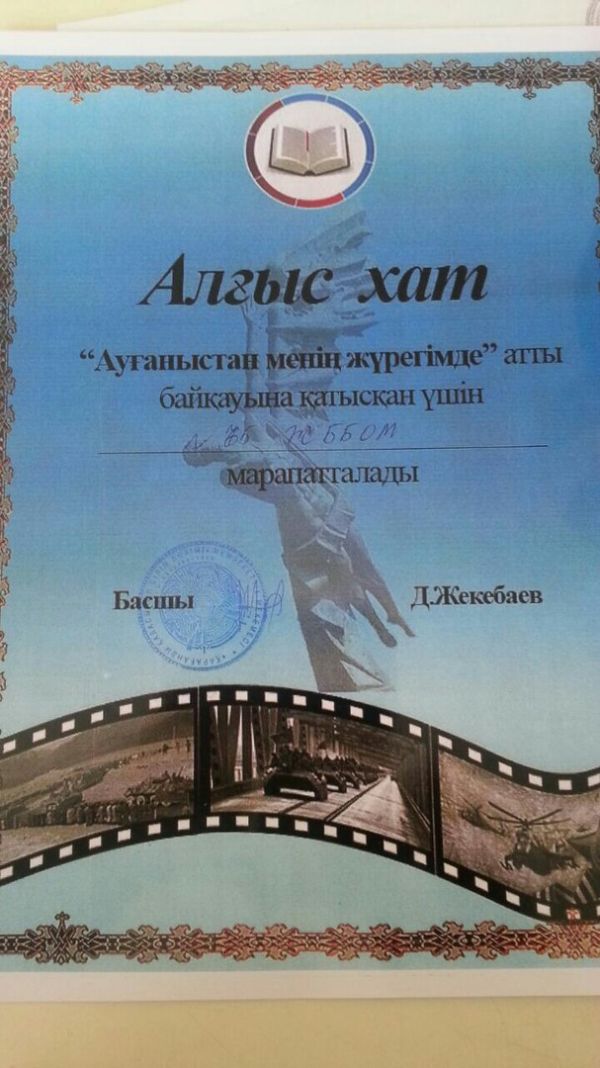 18.02. күні Қарағанды қаласы №74 жалпы орта білім беру мектебінде "Ауғаныстан менің жүрегімде" атты байқауына мектебіміздің 8-10 сынып оқушылары қатысып Алғыс хатқа ие болды.&n…