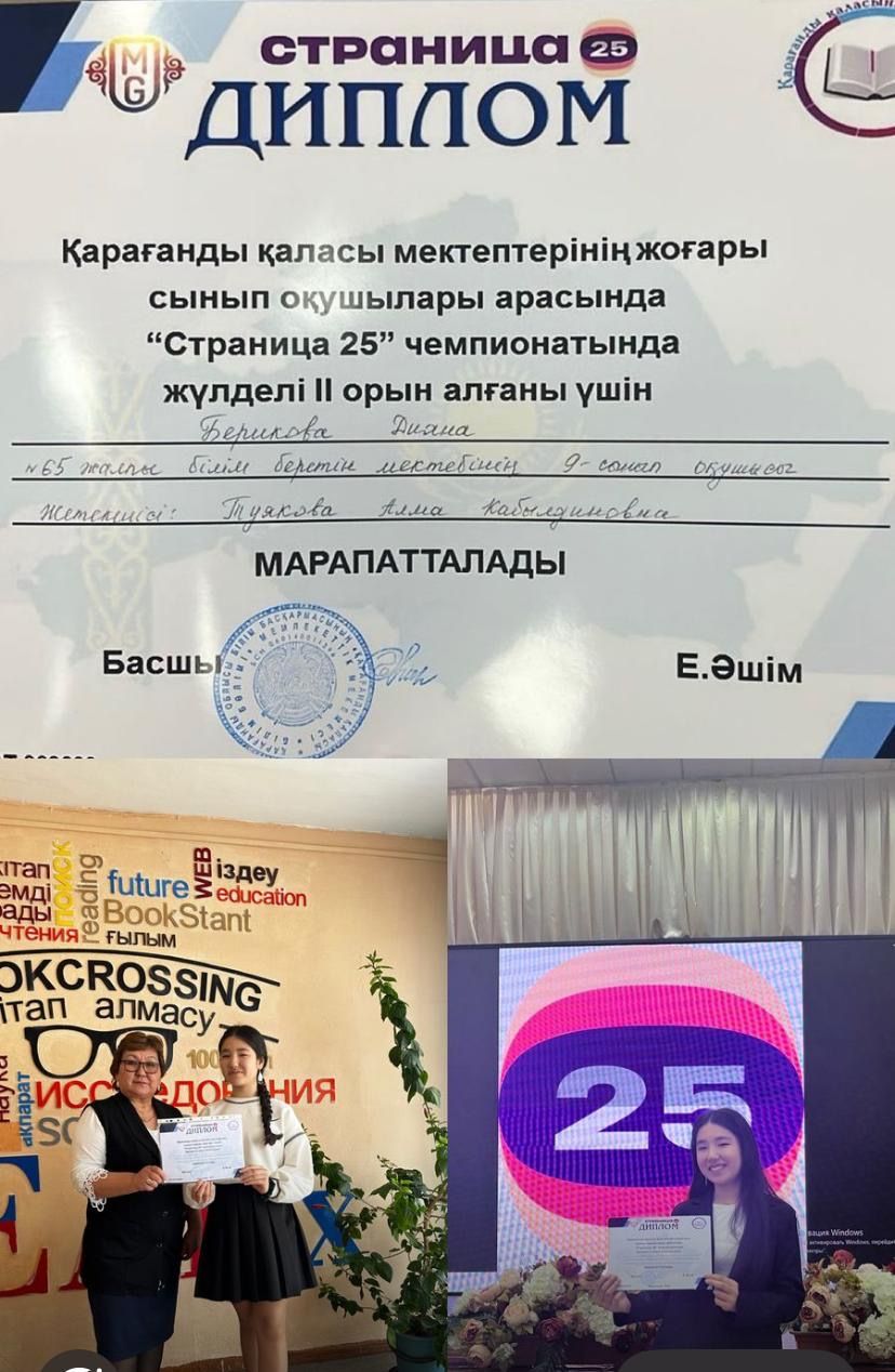 24.04.2025 г. Ученица 9 “Ә” класса Берикова Диана на Открытом Чемпионате по чтению вслух среди старшеклассников “Страница 25” заняла 2- место.