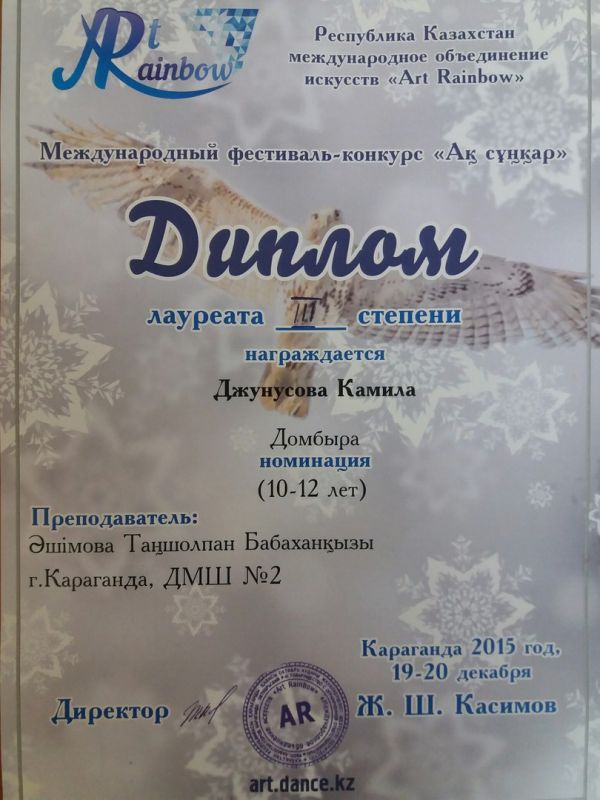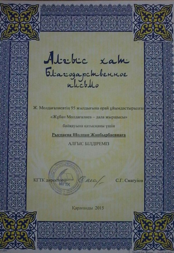 1. Ж.Молдағалиевтің 95 жылдығына орай Көпсалалы гуманитарлы-техникалық колледжі ұйымдастырған «Жұбан Молдағалиев – дала жыршысы» байқауына қатысып Рыспаева Шолпан Жанбырбайқызы алғ…