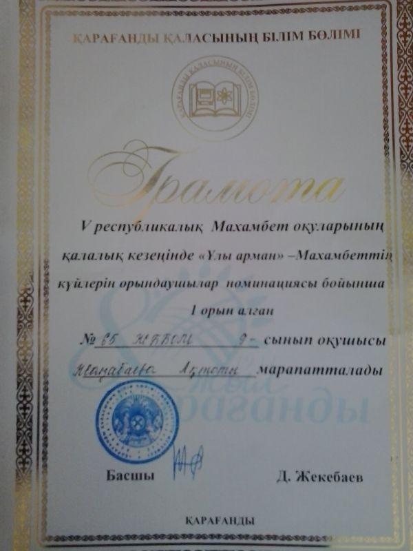 06 мамыр 2014 ж. өткен Ү республикалық Махамбет оқуларының қалалық кезеңінде «Ұлы арман» - Махамбеттің күйлерін орындаушылар номинациясы бойынша 9 сынып оқушысы Жаңабаева Ақтоты І орын и…