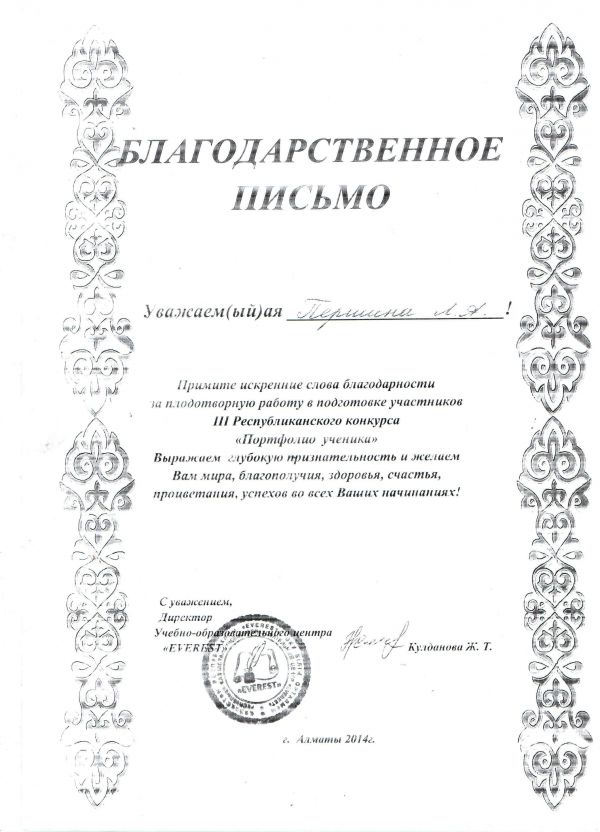 ІІІ Республикалық «Оқушы портфолиосы» атты байқауда бастауыш сыныптар арасында үздік портфолио иегері атанып, ІІІ орын иеленген 4 Сынып оқушысы Кроль Еленаны жеңісімен құттықтаймыз!
