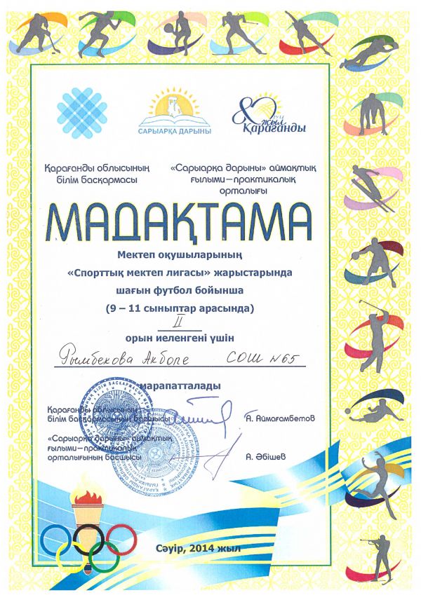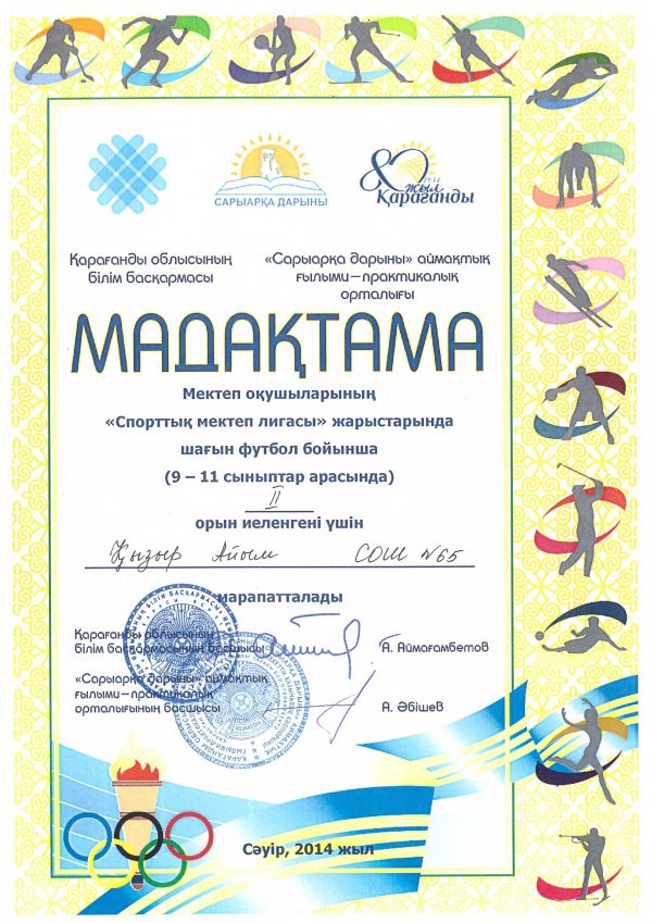 9-11 сынып қыздары арасында «Мектеп лигасы» бағдарламасы аясында шағын футболдан қалалық жарыстар финалында №65 ЖББ ОМ командасы ІІ орын иеленді.