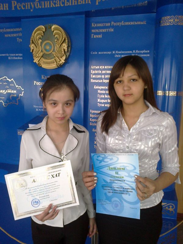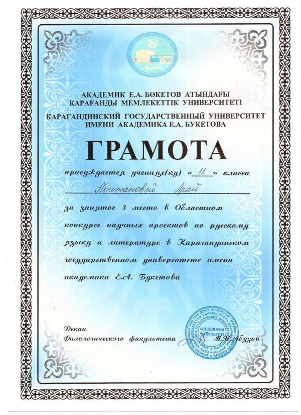 19 сәуір 2014 жылы Е.А.Бөкетов атындағы ҚарМУ-да өткен орыс тілі мен әдебиеті пәндері бойынша облыстық жоба қорғау байқауында ІІІ орын иеленген 11 «А» сынып оқушысы Акижанова Арайды жеңі…