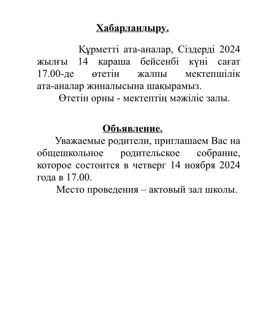 Құрметті ата-аналар, Сіздерді 2024 жылғы 14 қараша бейсенбі күні сағат 17.00-де өтетін жалпы мектепшілік ата-аналар жиналысына шақырамыз.