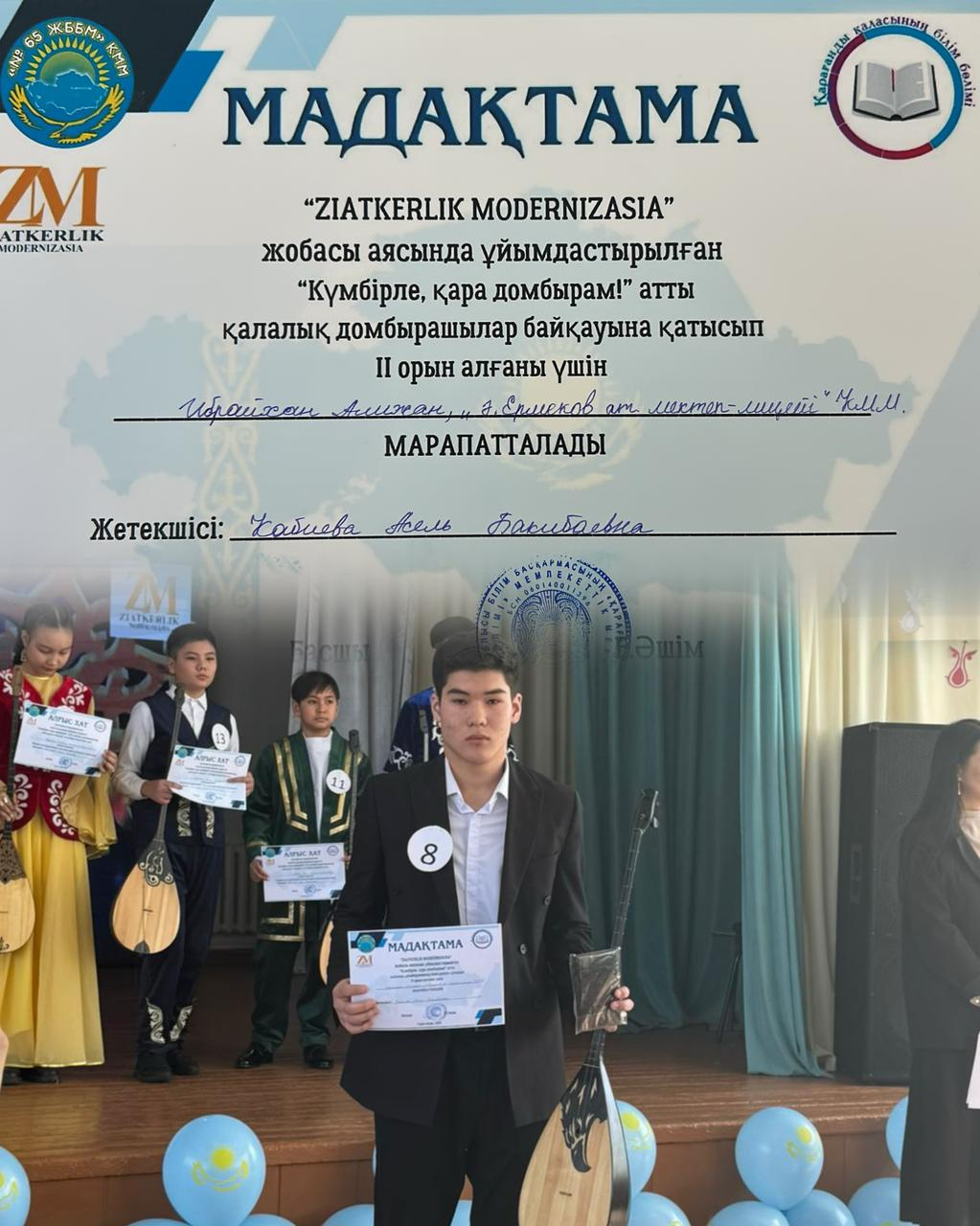 Мектебіміздің 10 сынып оқушысы Ибрайхан Алижан “Зияткерлік модернизация” жобасы аясында ұйымдастырылған “Күмбірле, қара домбырам” атты қалалық домбырашылар байқауына қатысып,…
