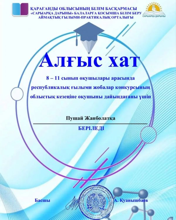 8-11 сынып оқушылары арасында "ДАРЫН-2022" республикалық ғылыми жобалар конкурсының облыстық кезеңінде "ИНФОРМАТИКА" секциясы бойынша II орынмен Әміртай Алмас МАРАПАТТАЛДЫ.