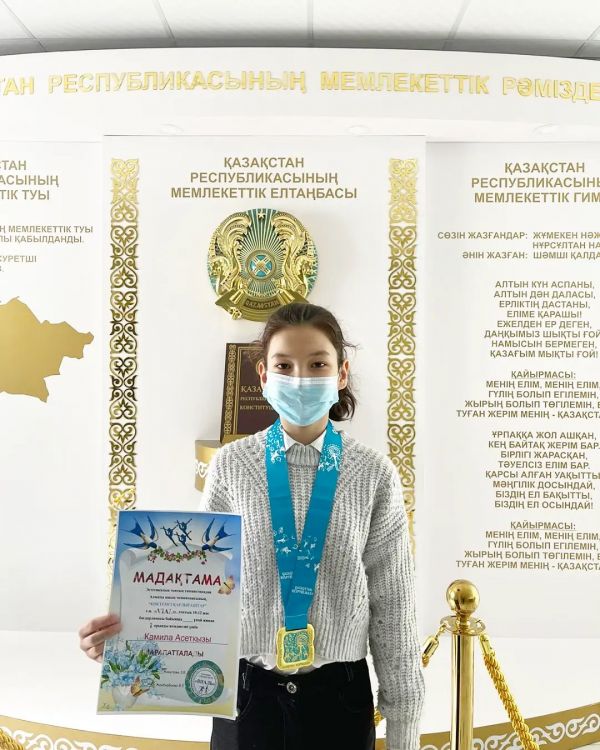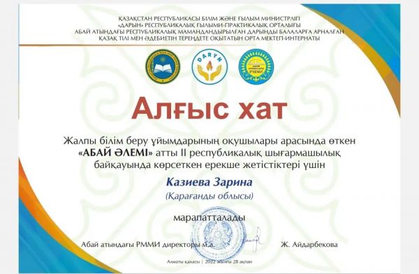 Жалпы білім беру ұйымдарының оқушылары арасында өткен «Абай әлемі» атты ІІ республикалық шығармашылық байқауында көрсеткен ерекше жетістіктері үшін мектебіміздің оқушысы Казиева Зарина а…