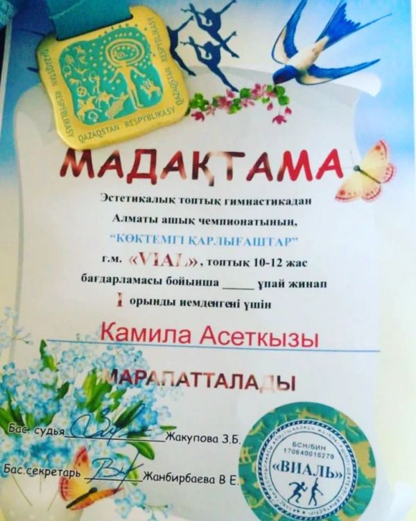 Мектебіміздің 6 “Ә” сынып оқушысы Әсетқызы Камила эстетикалық топтық гимнастикадан Алматы ашық чемпионатының “КӨКТЕМГІ ҚАРЛЫҒАШТАР” г.м. “VIAL” топтық бағдарламас…