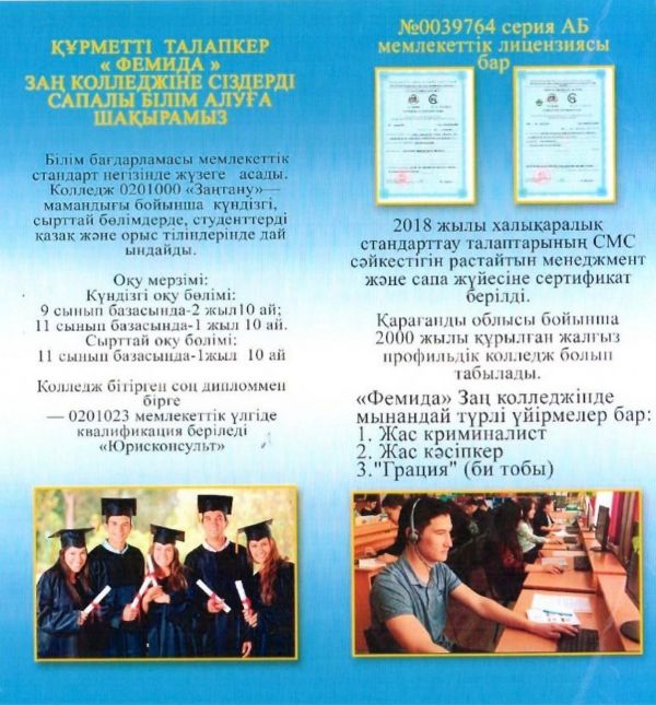 «ФЕМИДА» заң колледжі 9,11-сынып оқушыларына кәсіптік бағдар жұмыстарын жүргізді.