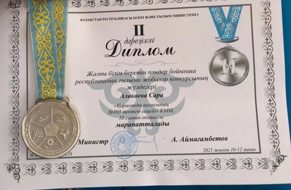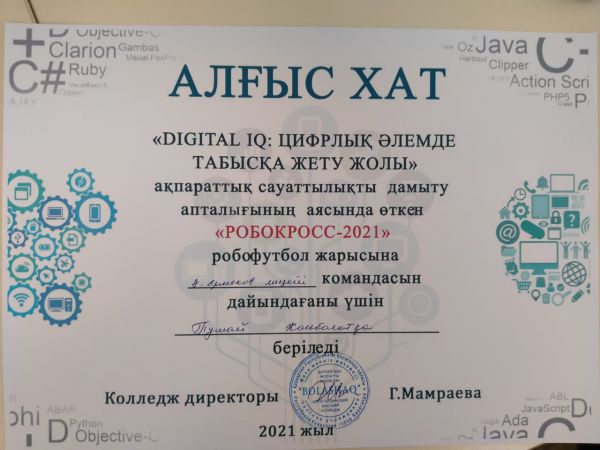 DIGITAL IQ цифрлық әлемінде табысқа жету жолы ақпараттық сауаттылық апталығы аясында робототехникадан "РОБОКРОСС-2021" робофутбол жарысында 2 орын алғаны үшін Ә. Ермеков атындағы мектеп-ли…