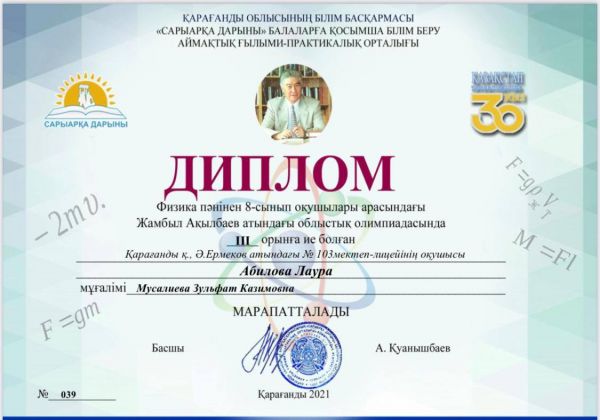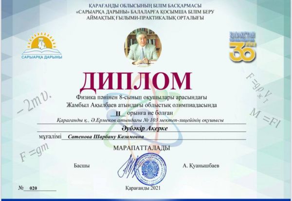 Физика пәнінен 8 - сыныптар оқушылар арасындағы облыстық олимпиадан оқушыларымыздың жетістігі. Құттықтаймыз!