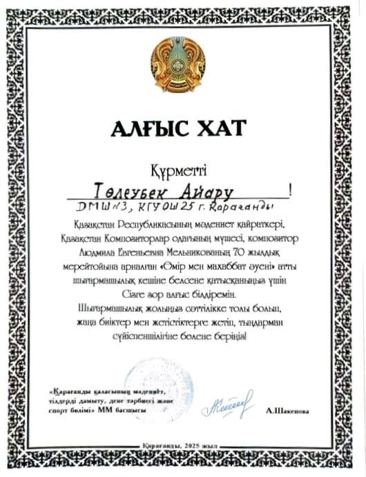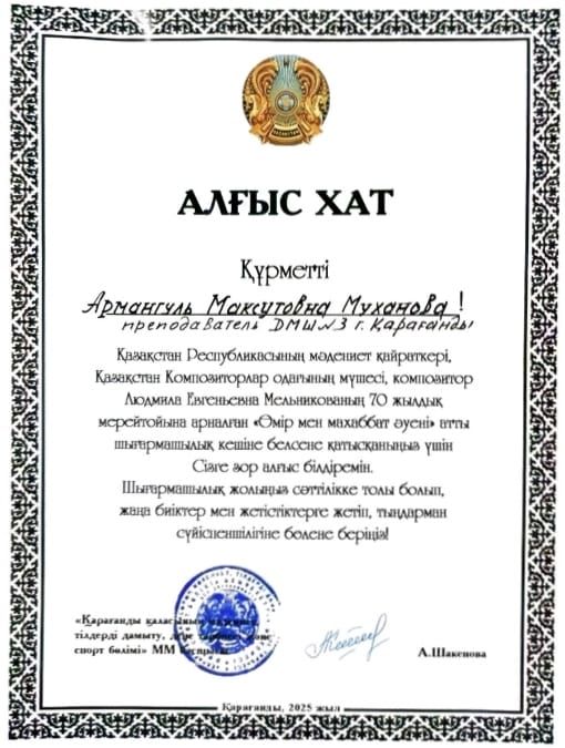 2025 жылдың 30 қарашасында өткен вокал- хор бөлімінің оқушысы Әбілқасым Сұлтантемірді, сондай- ақ ұстаздары А.М.Муханованы жән…