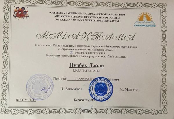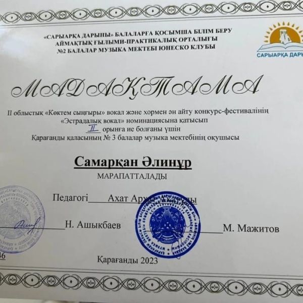 22 апреля 2023 год был проведен школьный конкурс "Інжу - маржан" среди учащихся специальности "Пение с домброй". Учащиеся педагогов Д.А.Абишке…
