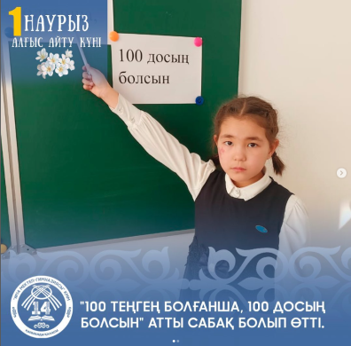 27.02.23 ж."Қаржылық сауаттылық" апталығы аясында 2"Б" сыныбында "100 теңгең болғанша,100 досың болсын" атты сабақ болып өтті
