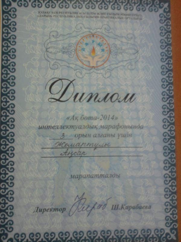 Республикалық "Ақбота-2014" интеллектуалдық марафонында 3 А сынып оқушылары Дарибаева Дариға, Жомартұлы Аңсар, Русланқызы Альмира, Нуретов Мухаммеда…
