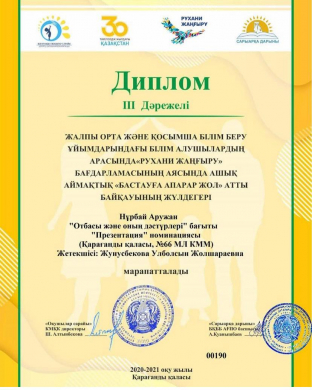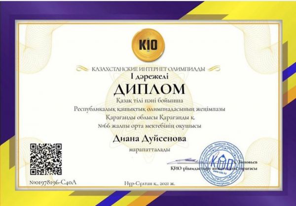 Қазақ тілінен өткен Республикалық КИО олимпиадасына 7Б сынып оқушылары Қайрат Ақбаян, Дүйсенова Диана, Нұрғисақызы Айбибі қатысып, аудан, облыс, республикалық деңгейден 1- орын жеңімпазы атанды.…